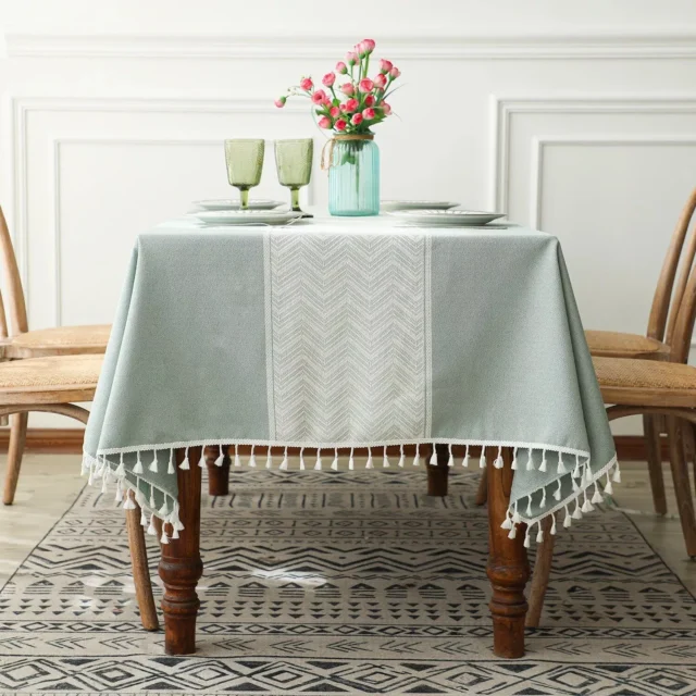 Crafted with a perfect blend of polyester and cotton, this tablecloth ensures durability and ease of maintenance. The jacquard style, combined with a geometric pattern, presents a refreshing and concise aesthetic that complements any decor. Adding to its charm are the tasteful tassels that gracefully adorn the edges, making it a stylish centerpiece for your table setting.
