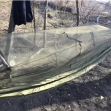 I do a lot of "bivouac" camping (courtesy of the Army) and dont usually have space to pack any sort of tentage other than a poncho so I thought I would give this a try seeing as how I've had a lot of back problems over the past few years. I tried it out a couple weeks back for the first time during a field exercise in a heavily wooded area surrounded by water. The mosquitos were out with a vengance so it was nice to be able to jump in this at night and not have to worry about them. Setup was easy and thanks to the other reviews I knew not to tie the net off too high so it didn't tear. I ended up connecting the net strings to bungee cords to give them a little flex. I would definitely recommend this hammock to anyone who does a lot of backpacking. It tears down and packs away into the connected bag very easily (unlike any tent I have ever owned).