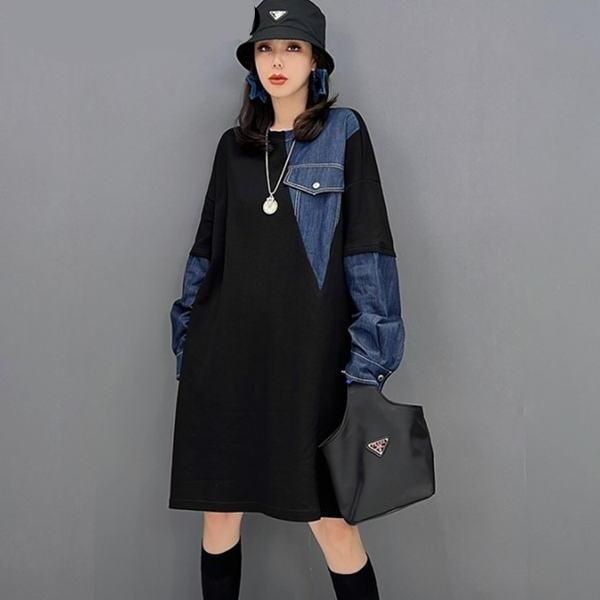 Korean Fashion Denim Patchwork Dress – Knee-Length Streetwear