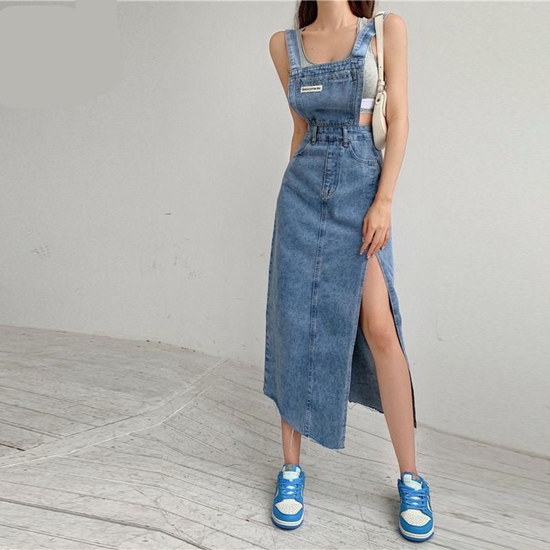 Chic Midi Denim Dress | Sleeveless Polo Collar & Side Slit