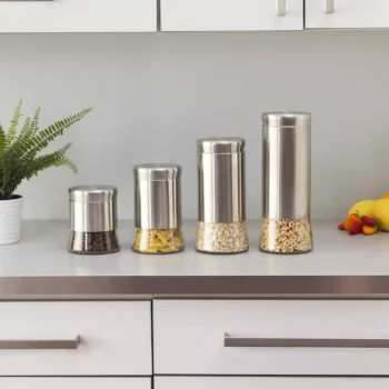 Essential Stainless Steel Kitchen Canister Set – 4 Pieces, Clear Glass Base, Airtight Lids