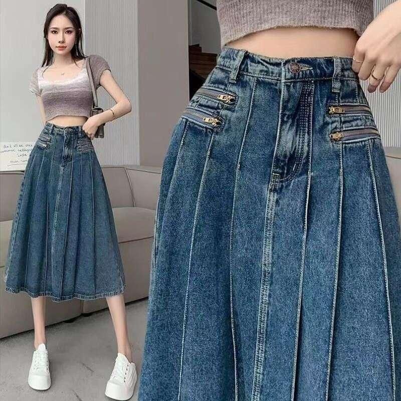 High-Waist A-Line Denim Midi Skirt – Vintage Pleated Y2K Grunge Style